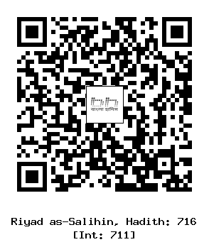 ৪/৭১৬। ইবনে শিমাসাহ হতে বর্ণিত, তিনি বলেন, ’আমর ইবনে ’আস রাদিয়াল্লাহু ’আনহু-এর মরণোন্মুখ সময়ে আমরা তাঁর নিকটে উপস্থিত হলাম। তিনি অনেকক্ষণ ধরে কাঁদতে থাকলেন এবং দেওয়ালের দিকে মুখ ফিরিয়ে নিলেন। এরূপ অবস্থা দেখে তাঁর এক ছেলে বলল, ’আব্বাজান! আপনাকে কি রাসূলুল্লাহ সাল্লাল্লাহু আলাইহি ওয়াসাল্লাম অমুক জিনিসের সুসংবাদ দেননি? আপনাকে কি রাসূলুল্লাহ সাল্লাল্লাহু আলাইহি ওয়াসাল্লাম অমুক জিনিসের সুসংবাদ দেননি?’ এ কথা শুনে তিনি তাঁর চেহারা সামনের দিকে করে বললেন, আমাদের সর্বোত্তম পুঁজি হল, এই সাক্ষ্য প্রদান করা যে, আল্লাহ ছাড়া কোন সত্য উপাস্য নেই এবং মুহাম্মাদ সাল্লাল্লাহু আলাইহি ওয়াসাল্লাম আল্লাহর রাসূল। আমি তিনটি স্তর অতিক্রম করেছি। (এক) আমার চেয়ে রাসূলুল্লাহ সাল্লাল্লাহু আলাইহি ওয়াসাল্লাম এর প্রতি বড় বিদ্বেষী আর কেউ ছিল না। তাঁকে হত্যা করার ক্ষমতা অর্জন করাই ছিল আমার তৎকালীন সর্বাধিক প্রিয় বাসনা। যদি (দুর্ভাগ্যক্রমে) তখন মারা যেতাম, তাহলে নিঃসন্দেহে আমি জাহান্নামী হতাম।