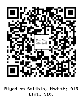 ১/৯১৫। ইবনে আব্বাস রাদিয়াল্লাহু ’আনহু হতে বর্ণিত, আলী ইবনে আবী ত্বালেব রাদিয়াল্লাহু ’আনহু রাসূলুল্লাহ সাল্লাল্লাহু আলাইহি ওয়াসাল্লাম এর নিকট হতে তাঁর সেই অসুস্থ অবস্থায় বের হলেন, যাতে তিনি মৃত্যুবরণ করেছিলেন। অতঃপর লোকেরা বলল, ’হে হাসানের পিতা! রাসূলুল্লাহ সাল্লাল্লাহু আলাইহি ওয়াসাল্লাম কী অবস্থায় সকাল করলেন?’ তিনি বললেন, ’আলহামদু লিল্লাহ, তিনি ভাল অবস্থায় সকাল করলেন।’ (বুখারী) [1]