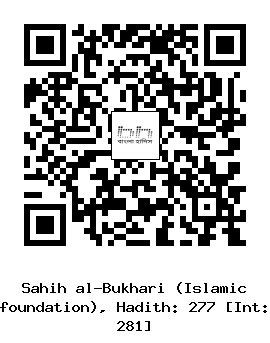 ২৭৭। আবদান (রহঃ) ... মায়মূনা (রাঃ) থেকে বর্ণিত, তিনি বলেনঃ আমি নবী সাল্লাল্লাহু আলাইহি ওয়াসাল্লাম এর জন্য পর্দা করেছিলাম আর তিনি জানবাতের গোসল করছিলেন। তিনি দু’হাত ধুইলেন। তারপর ডান হাত দিয়ে বাম হাতে পানি নিয়ে লজ্জাস্থান এবং যেখানে কিছু লেগেছিল তা ধুয়ে ফেললেন। তারপর মাটিতে বা দেওয়ালে হাত ঘষলেন এবং দু’পা ছাড়া সালাতের উযূর মতই উযূ (ওজু/অজু/অযু) করলেন। তারপর তাঁর সমস্ত শরীরে পানি পৌঁছালেন। তারপর একটু সরে গিয়ে দু’পা ধুইলেন।