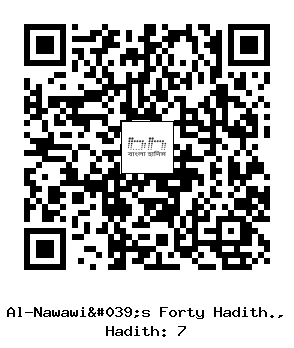 ৭। আবূ রুকাইয়্যা তামীম ইবনু আওস আদ্-দারী রাদিয়াল্লাহু ’আনহু হতে বর্ণিত হয়েছে- নবী সাল্লাল্লাহু ’আলাইহি ওয়াসাল্লাম বলেছেন: দ্বীন হচ্ছে শুভকামনা। আমরা জিজ্ঞেস করলাম: কার জন্য? তিনি বললেন: আল্লাহ্, তাঁর কিতাবের, তাঁর রাসূলের, মুসলিম নেতাদের এবং সকল মুসলিমের জন্য।
