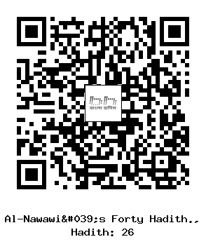 ২৬। আবূ হুরায়রা রাদিয়াল্লাহু ’আনহু হতে বর্ণিত হয়েছে, রাসূলুল্লাহ্ সাল্লাল্লাহু ’আলাইহি ওয়াসাল্লাম বলেছেন: "প্রত্যেহ যখন সূর্য উঠে মানুষের (শরীরের) প্রত্যেক গ্রন্থির সাদকাহ্ দেয়া অবশ্য কর্তব্য। দু’জন মানুষের মাঝে ইনসাফ করা হচ্ছে সাদকাহ্, কোন আরোহীকে তার বাহনের উপর আরোহন করতে বা তার উপর বোঝা উঠাতে সাহায্য করা হচ্ছে সাদকাহ্, ভাল কথা হচ্ছে সাদকাহ্, সালাতের জন্য প্রত্যেক পদক্ষেপ হচ্ছে সাদকাহ্ এবং কষ্টদায়ক জিনিস রাস্তা থেকে সরানো হচ্ছে সাদকাহ্।"