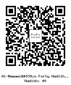 ৪০। ইবনু উমার রাদিয়াল্লাহু ’আনহুমা হতে বর্ণিত, তিনি বলেন- রাসূলুল্লাহ সাল্লাল্লাহু ’আলাইহি ওয়াসাল্লাম আমার কাঁধ ধরে বললেন: দুনিয়াতে অপরিচিত অথবা ভ্রমণকারী মুসাফিরের মত হয়ে যাও।