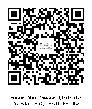৯৫৭. মুসাদ্দাদ (রহঃ) .... ওয়ায়েল ইবনে হুজর (রাঃ) হতে বর্ণিত। তিনি বলেন, একদা আমি রাসূলুল্লাহ সাল্লাল্লাহু আলাইহি ওয়াসাল্লাম এর নামায আদায়ের পদ্ধতির প্রতি নজর করি। আমি দেখি যে, রাসূলুল্লাহ সাল্লাল্লাহু আলাইহি ওয়াসাল্লাম কিবলামুখী হয়ে দণ্ডায়মান হন। অতঃপর তিনি ’আল্লাহু আকবার’ বলে স্বীয় উভয় হস্ত কান পর্যন্ত উঠান এবং পরে ডান হাত দ্বারা বাম হাত চেপে ধরেন। পরে যখন তিনি রুকু করার ইরাদা করেন, তখন তিনি উভয় হস্ত অনুরূপভাবে উত্তোলন করেন। অতঃপর তিনি বাম পা বিছিয়ে দিয়ে, বাম হাত উক্ত পায়ের রানের উপর রাখেন এবং ডান হাতের কনুই ডান পা হতে বিচ্ছিন্নভাবে রাখেন এবং কনিষ্ঠ ও অমানিকা আংগুলীদ্বয়কে গুটিয়ে রাখেন এবং ডান বৃদ্ধাঙ্গুলিকে মধ্যমার সাথে মিশ্রিত করে বৃত্তাকার রাখেন। অতঃপর আমি তাঁকে এরূপ করতে দেখেছি। (রাবী বলেন) অতঃপর বিশর তাঁর বৃদ্ধাংগুলোকে মধ্যমার সাথে মিলিয়ে বৃত্তাকারে রাখেন এবং শাহাদাত আংগুলি দ্বারা ইশারা করেন। (নাসাঈ, ইবনে মাজাহ)।