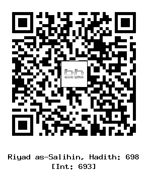 ১/৬৯৮। আদী ইবনে হাতেম রাদিয়াল্লাহু ’আনহু বলেন, আল্লাহর রাসূল সাল্লাল্লাহু আলাইহি ওয়াসাল্লাম বলেছেন, যদি আধখানা খেজুর দান করে জাহান্নামের আগুন থেকে বাঁচতে পার তবুও বাঁচ। যদি কোন ব্যক্তি এটাও না পায়, তাহলে সে যেন ভাল কথা বলে বাঁচে। (বুখারী ও মুসলিম) [1]