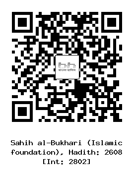 ২৬০৮। মূসা ইবনু ইসমাইল (রহঃ) ... জুনদুব ইবনু সুফিয়ান (রাঃ) থেকে বর্ণিত, কোন এক যুদ্ধে রাসূলুল্লাহ সাল্লাল্লাহু আলাইহি ওয়াসাল্লাম এর একটি আঙ্গুল রক্তাক্ত হলে তিনি (এই কবিতাটি) পড়েছিলেনঃ هَلْ أَنْتِ إِلاَّ إِصْبَعٌ دَمِيتِ، وَفِي سَبِيلِ اللَّهِ مَا لَقِيتِ তুমি তো একটি আঙ্গুল মাত্র; তুমি তো রক্তাক্ত হয়েছ আল্লাহরই পথে।