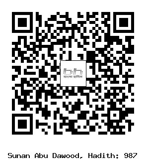 ৯৮৭। ’আলী ইবনু ’আবদুর রহমান আল-মু’আবী (রহঃ) সূত্রে বর্ণিত। তিনি বলেন, একদা ’আবদুল্লাহ ইবনু ’উমার (রাঃ) আমাকে সালাতের মধ্যে নুড়ি পাথর দিয়ে অনর্থক নাড়াচাড়া করতে দেখলেন। অতঃপর যখন তার সালাত শেষ হলো তিনি আমাকে এরূপ করতে নিষেধ করলেন এবং বললেন, রাসূলুল্লাহ সাল্লাল্লাহু আলাইহি ওয়াসাল্লাম সালাতে যা করতেন তুমিও তাই করবে। আমি বললাম, রাসূলুল্লাহ সাল্লাল্লাহু আলাইহি ওয়াসাল্লাম সালাতে কি করতেন? তিনি বললেন, সালাতরত অবস্থায় তিনি যখন বসতেন তখন তাঁর ডান হাতের তালু ডান উরুর উপর রাখতেন এবং সব আঙ্গুল বন্ধ করে রাখতেন আর বৃদ্ধাঙ্গুলির পাশের (শাহাদাত) অঙ্গুলি দ্বারা ইশারা করতেন, আর বাম হাতের তালু বাম পায়ের উরুর উপর রাখতেন।[1]
