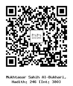 ২৪৬) আনাস বিন মালেক (রাঃ) হতে বর্ণিত, তাঁর দাদী মুলায়কা একদিন রাসূল সাল্লাল্লাহু আলাইহি ওয়া সাল্লামের জন্য খানা তৈরী করে তাঁকে দাওয়াত করলেন। নবী সাল্লাল্লাহু আলাইহি ওয়া সাল্লাম তা থেকে খেলেন। অতঃপর খাওয়া শেষে তিনি বললেনঃ দাঁড়াও! আমি তোমাদেরকে নিয়ে নামায পড়বো। আনাস (রাঃ) বলেনঃ আমি একটি পুরাতন চাটাই নিয়ে আসলাম, যা বেশী ব্যবহার করার কারণে কালো হয়ে গিয়েছিল। তাই আমি পানি দিয়ে তা ধৌত করলাম। তারপর রাসূল সাল্লাল্লাহু আলাইহি ওয়া সাল্লাম তাতে দাঁড়ালেন। আমি এবং একটি এতীম ছেলে তাঁর পেছনে দাঁড়ালাম। আর আমার বৃদ্ধা দাদী আমাদের পেছনে দাঁড়ালেন। অতঃপর নবী সাল্লাল্লাহু আলাইহি ওয়া সাল্লাম আমাদেরকে নিয়ে দু’রাকআত নামায পড়ে সে স্থান থেকে প্রস্থান করলেন।